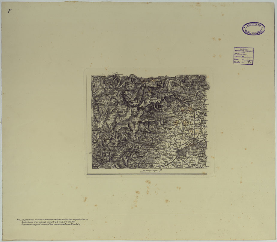 "La planimetria e le curve si ottennero mediante la riduzione e riproduzione in fotoincisione di un originale eseguito alla scala di 1:250.000. Il terreno fu eseguito su rame a luce zenitale mrdiante la "roulette""