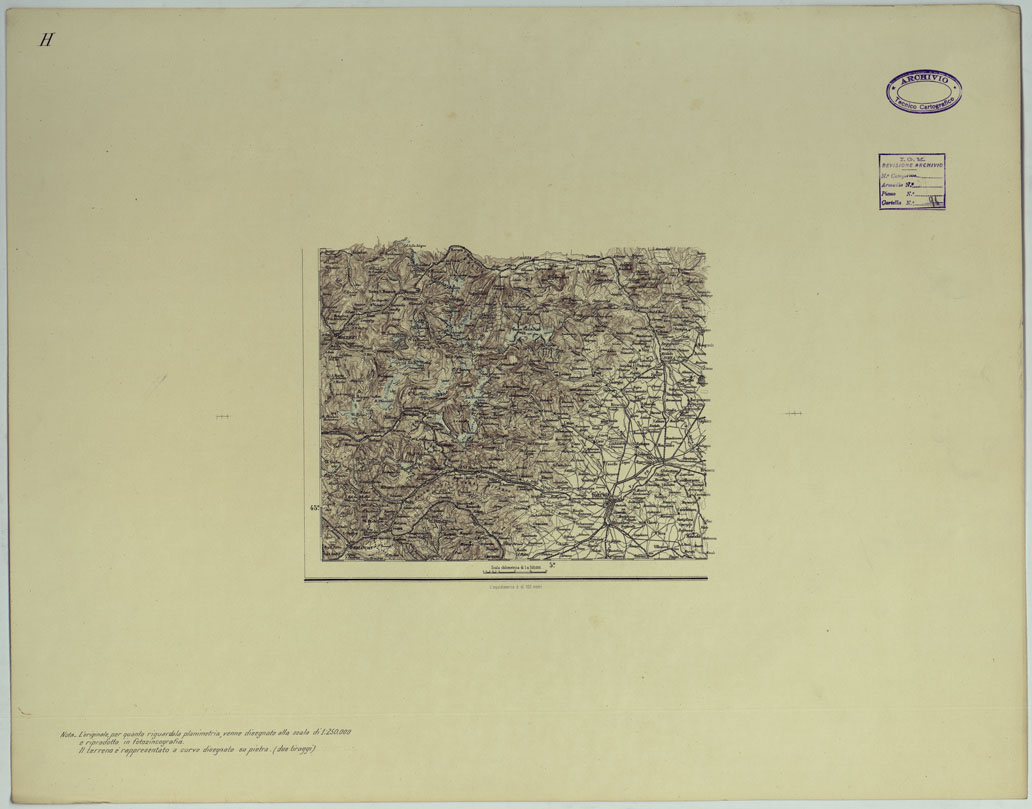 "L'originale, per quanto riguarda la planimetria, venne disegnato alla scala di 1:250.000 e rprodotto in fotozincografia. Il terreno è rappresentato a curve disegnate su pietra."