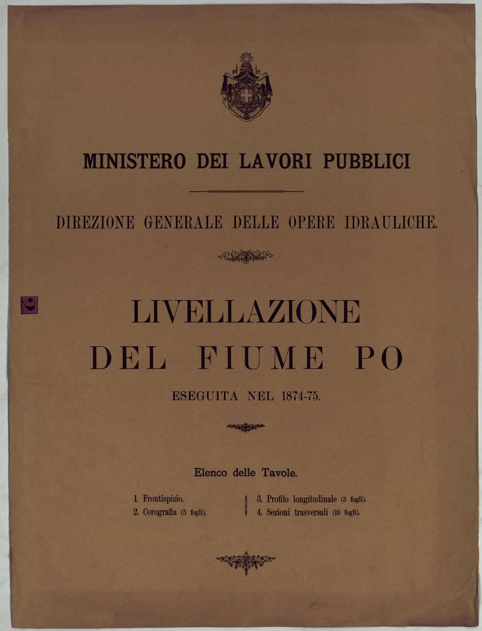 "Livellazione del fiume Po da Moncalieri al mare eseguita negli anni 1874-1875 dagli uffici del Genio Civile di Torino, Pavia, Milano, Piacenza, Mantova, Parma, Reggio Emilia, Rovigo e Ferrara per deliberazione della Commissione Tecnico-Scentifico istituita con R° Decreto 16 Febbraio 1873 sotta la direzione dell'Ispettore del Genio Civile Comm.e P. Barillari e pubblicata per cura della Direzione Generale delle Opere Idrauliche."