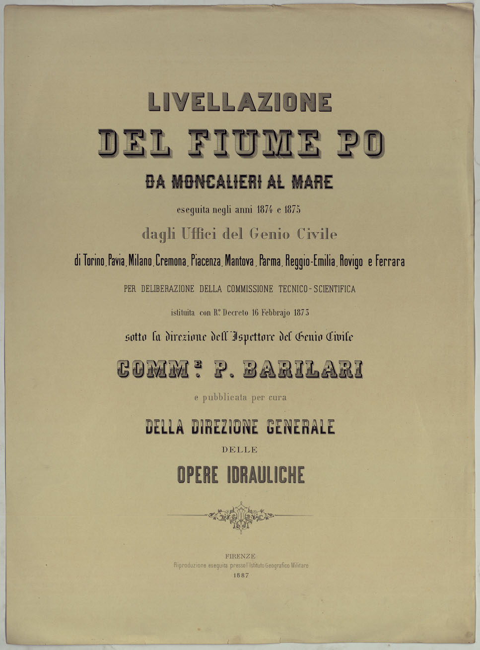 "Livellazione del fiume Po da Moncalieri al mare eseguita negli anni 1874-1875 dagli uffici del Genio Civile di Torino, Pavia, Milano, Piacenza, Mantova, Parma, Reggio Emilia, Rovigo e Ferrara per deliberazione della Commissione Tecnico-Scentifico istituita con R° Decreto 16 Febbraio 1873 sotta la direzione dell'Ispettore del Genio Civile Comm.e P. Barillari e pubblicata per cura della Direzione Generale delle Opere Idrauliche."