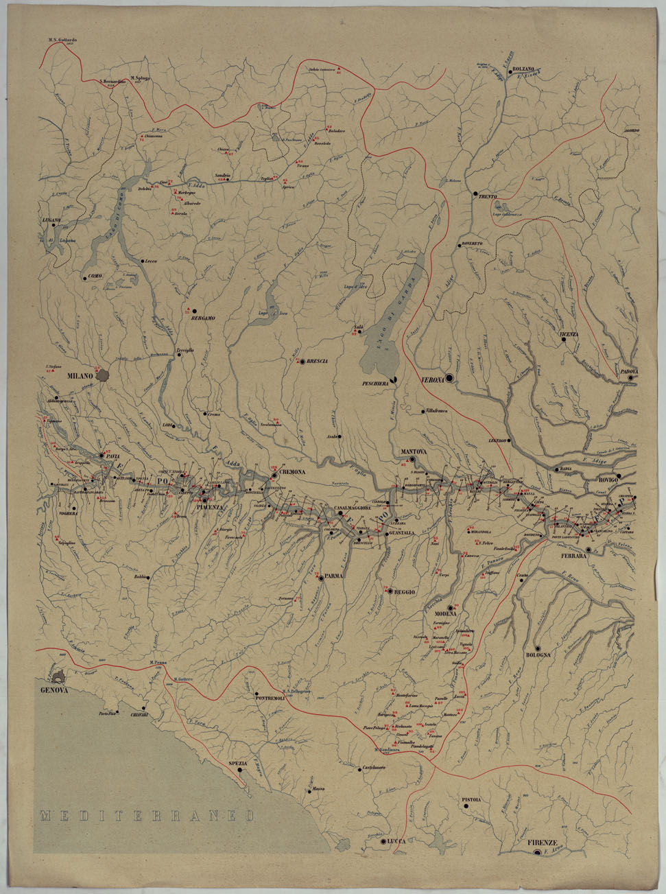 "COROGRAFIA DEL FIUME PO BACINO ED AFFLUNTI. - Livellazione del fiume Po da Moncalieri al mare eseguita negli anni 1874-1875 dagli uffici del Genio Civile di Torino, Pavia, Milano, Piacenza, Mantova, Parma, Reggio Emilia, Rovigo e Ferrara per deliberazione della Commissione Tecnico-Scentifico istituita con R° Decreto 16 Febbraio 1873 sotta la direzione dell'Ispettore del Genio Civile Comm.e P. Barillari e pubblicata per cura della Direzione Generale delle Opere Idrauliche."