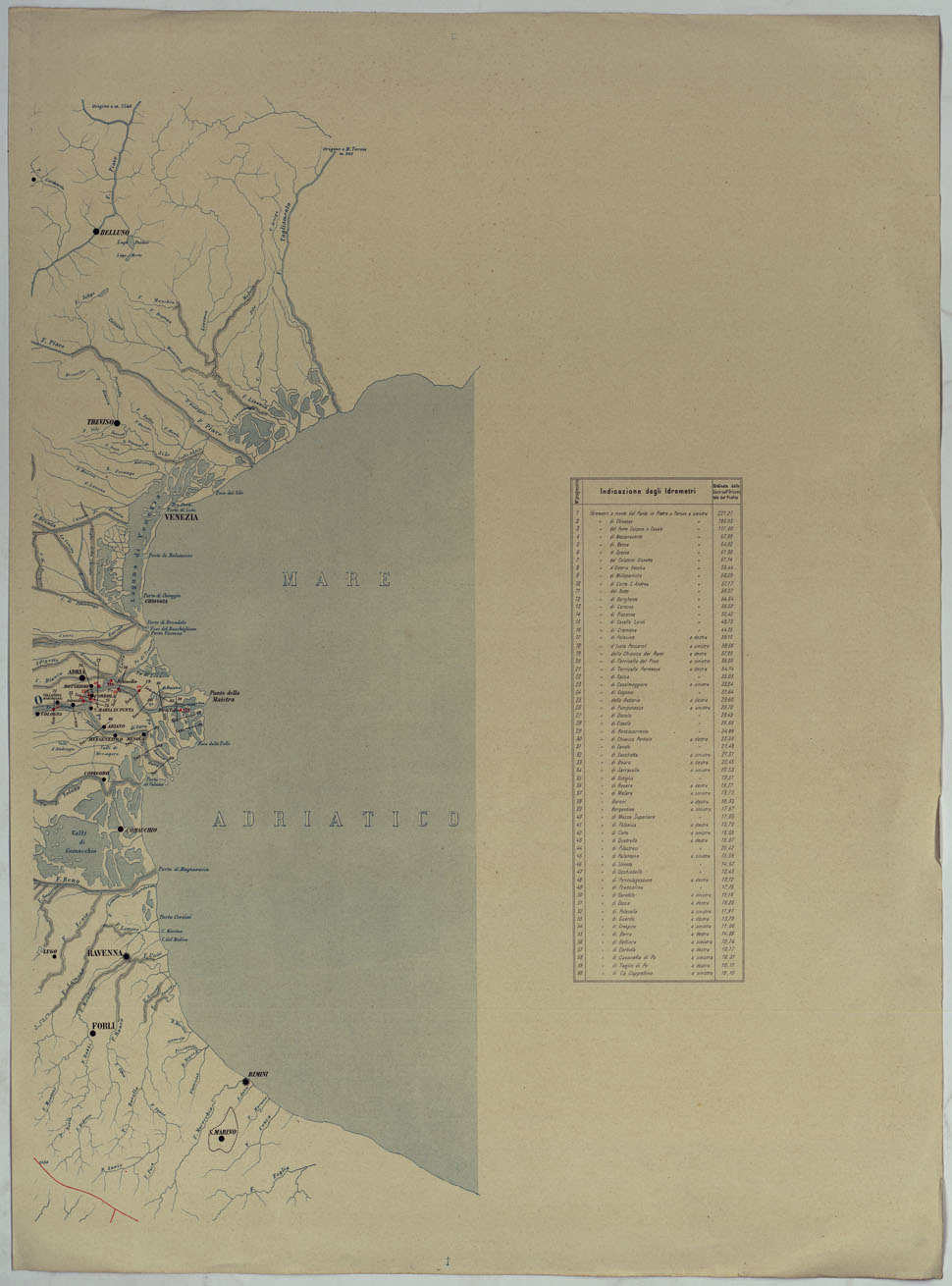 "COROGRAFIA DEL FIUME PO BACINO ED AFFLUNTI. - Livellazione del fiume Po da Moncalieri al mare eseguita negli anni 1874-1875 dagli uffici del Genio Civile di Torino, Pavia, Milano, Piacenza, Mantova, Parma, Reggio Emilia, Rovigo e Ferrara per deliberazione della Commissione Tecnico-Scentifico istituita con R° Decreto 16 Febbraio 1873 sotta la direzione dell'Ispettore del Genio Civile Comm.e P. Barillari e pubblicata per cura della Direzione Generale delle Opere Idrauliche."