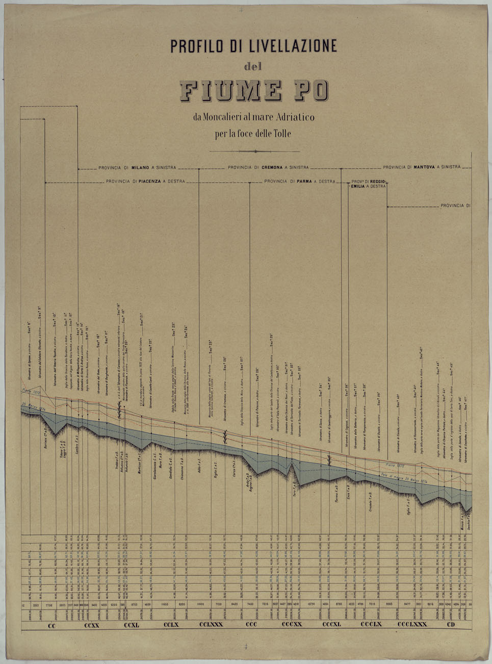 "PROFILO DI LEVELLAZIONE DEL FIUME PO DA MONCALIERI AL MARE ADRIATICO PER LA FOCE DELLE TOLLE. - Livellazione del fiume Po da Moncalieri al mare eseguita negli anni 1874-1875 dagli uffici del Genio Civile di Torino, Pavia, Milano, Piacenza, Mantova, Parma, Reggio Emilia, Rovigo e Ferrara per deliberazione della Commissione Tecnico-Scentifico istituita con R° Decreto 16 Febbraio 1873 sotta la direzione dell'Ispettore del Genio Civile Comm.e P. Barillari e pubblicata per cura della Direzione Generale delle Opere Idrauliche."