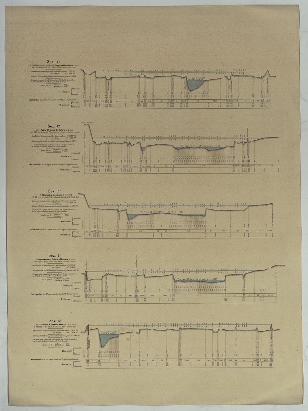 "PROFILO DI LEVELLAZIONE DEL FIUME PO DA MONCALIERI AL MARE ADRIATICO PER LA FOCE DELLE TOLLE. - Livellazione del fiume Po da Moncalieri al mare eseguita negli anni 1874-1875 dagli uffici del Genio Civile di Torino, Pavia, Milano, Piacenza, Mantova, Parma, Reggio Emilia, Rovigo e Ferrara per deliberazione della Commissione Tecnico-Scentifico istituita con R° Decreto 16 Febbraio 1873 sotta la direzione dell'Ispettore del Genio Civile Comm.e P. Barillari e pubblicata per cura della Direzione Generale delle Opere Idrauliche."