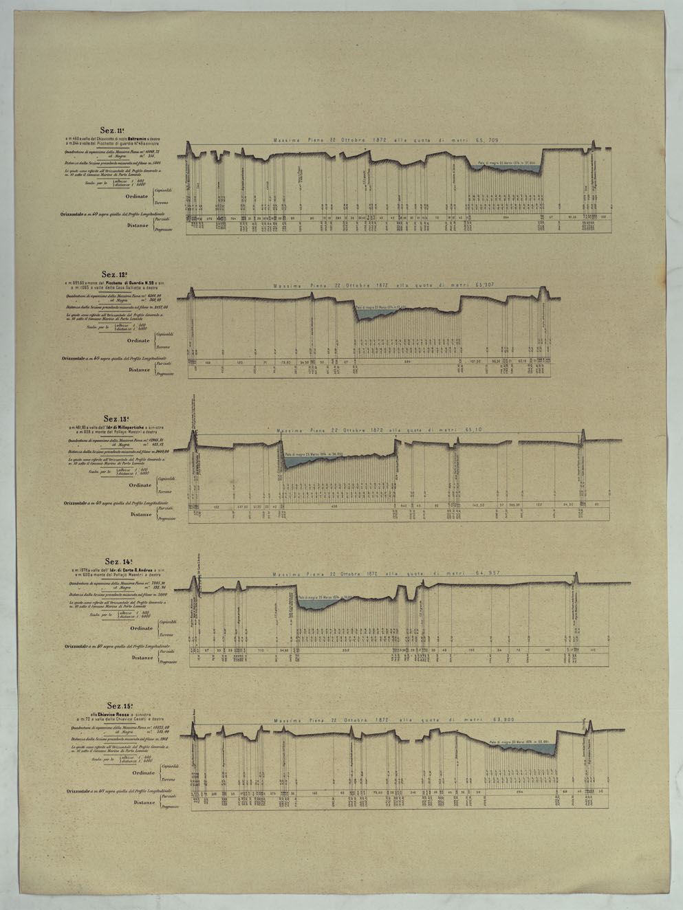 "PROFILO DI LEVELLAZIONE DEL FIUME PO DA MONCALIERI AL MARE ADRIATICO PER LA FOCE DELLE TOLLE. - Livellazione del fiume Po da Moncalieri al mare eseguita negli anni 1874-1875 dagli uffici del Genio Civile di Torino, Pavia, Milano, Piacenza, Mantova, Parma, Reggio Emilia, Rovigo e Ferrara per deliberazione della Commissione Tecnico-Scentifico istituita con R° Decreto 16 Febbraio 1873 sotta la direzione dell'Ispettore del Genio Civile Comm.e P. Barillari e pubblicata per cura della Direzione Generale delle Opere Idrauliche."