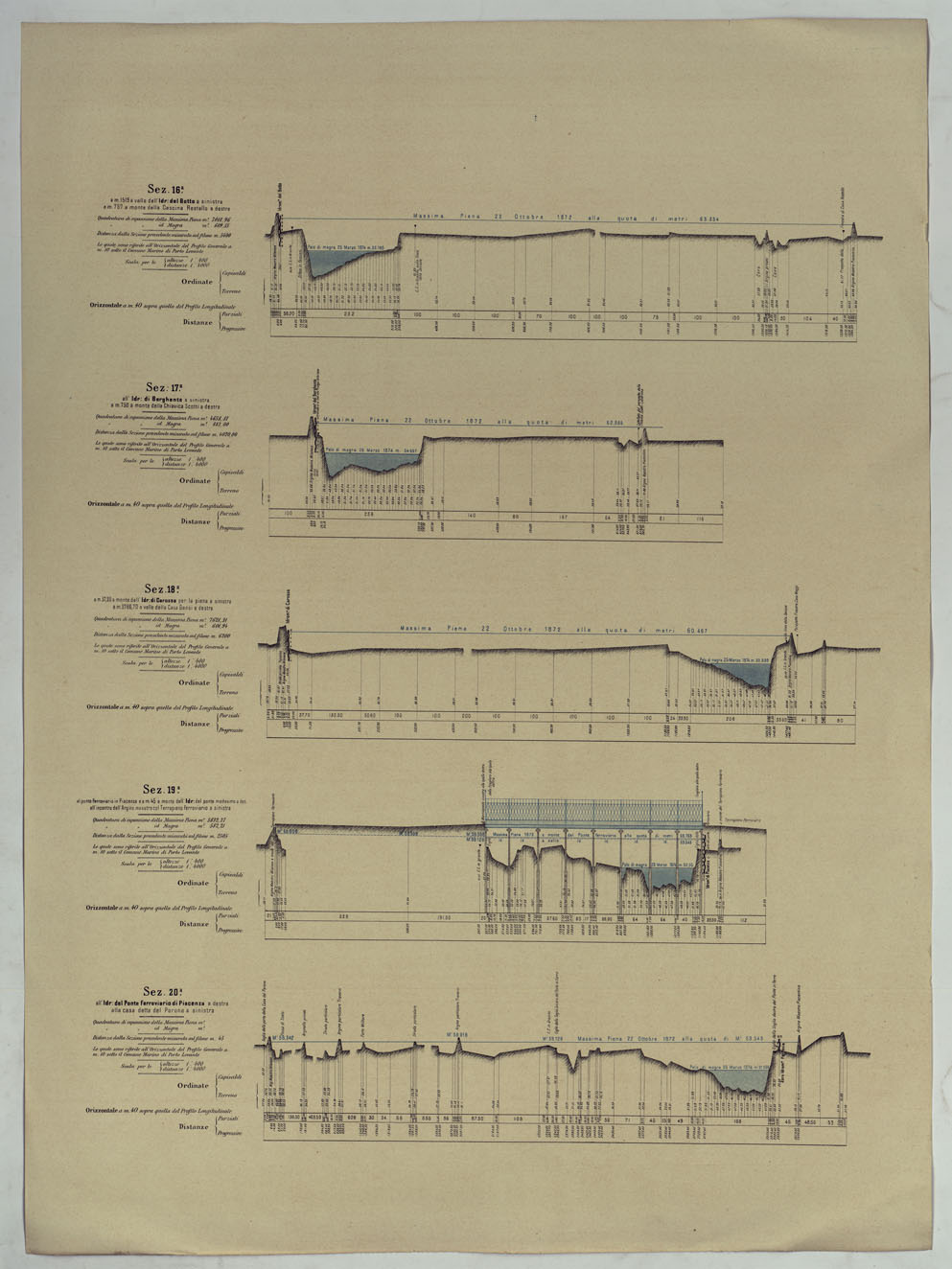 "PROFILO DI LEVELLAZIONE DEL FIUME PO DA MONCALIERI AL MARE ADRIATICO PER LA FOCE DELLE TOLLE. - Livellazione del fiume Po da Moncalieri al mare eseguita negli anni 1874-1875 dagli uffici del Genio Civile di Torino, Pavia, Milano, Piacenza, Mantova, Parma, Reggio Emilia, Rovigo e Ferrara per deliberazione della Commissione Tecnico-Scentifico istituita con R° Decreto 16 Febbraio 1873 sotta la direzione dell'Ispettore del Genio Civile Comm.e P. Barillari e pubblicata per cura della Direzione Generale delle Opere Idrauliche."