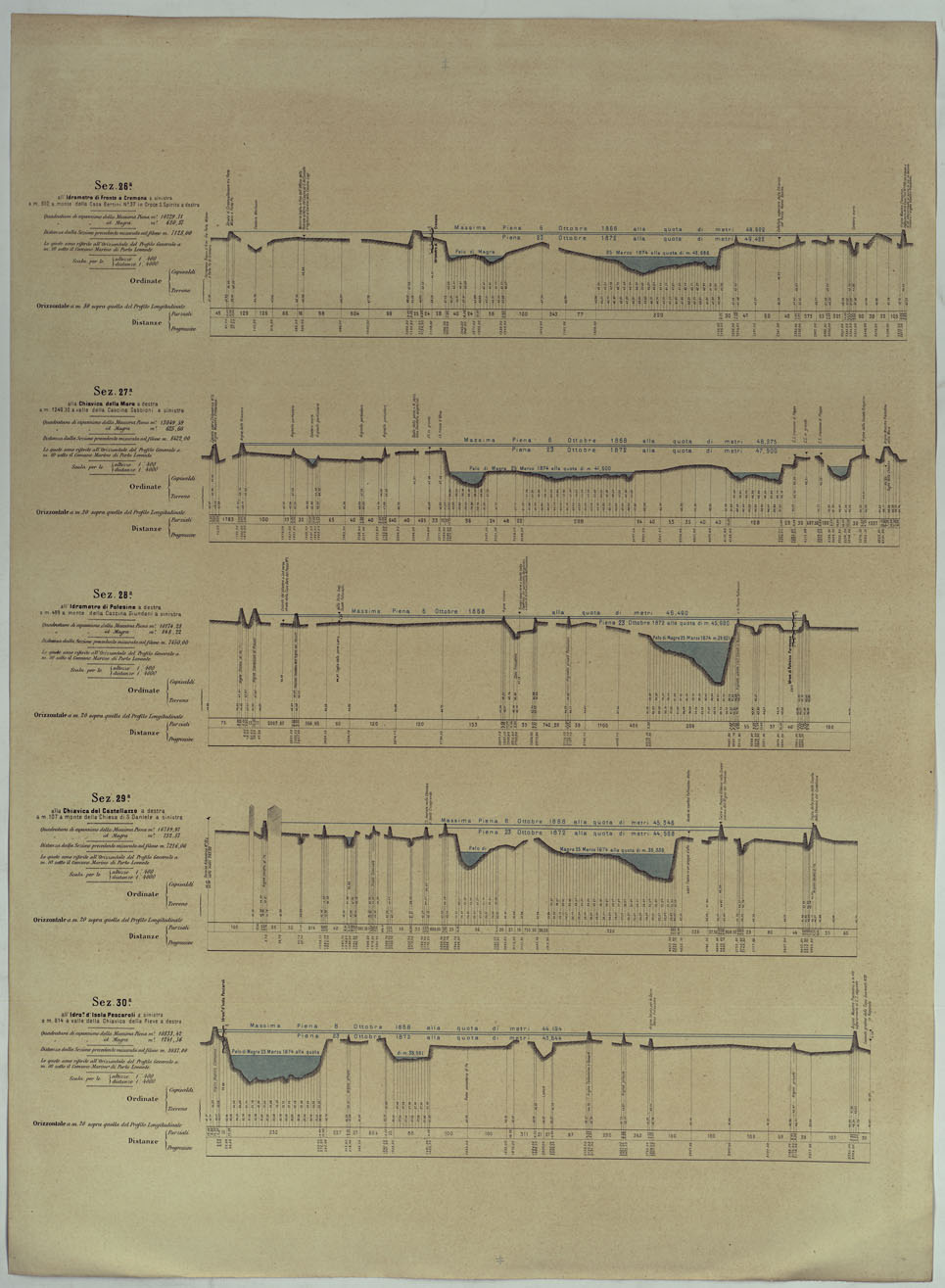 "PROFILO DI LEVELLAZIONE DEL FIUME PO DA MONCALIERI AL MARE ADRIATICO PER LA FOCE DELLE TOLLE. - Livellazione del fiume Po da Moncalieri al mare eseguita negli anni 1874-1875 dagli uffici del Genio Civile di Torino, Pavia, Milano, Piacenza, Mantova, Parma, Reggio Emilia, Rovigo e Ferrara per deliberazione della Commissione Tecnico-Scentifico istituita con R° Decreto 16 Febbraio 1873 sotta la direzione dell'Ispettore del Genio Civile Comm.e P. Barillari e pubblicata per cura della Direzione Generale delle Opere Idrauliche."