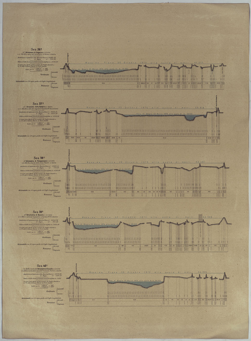 "PROFILO DI LEVELLAZIONE DEL FIUME PO DA MONCALIERI AL MARE ADRIATICO PER LA FOCE DELLE TOLLE. - Livellazione del fiume Po da Moncalieri al mare eseguita negli anni 1874-1875 dagli uffici del Genio Civile di Torino, Pavia, Milano, Piacenza, Mantova, Parma, Reggio Emilia, Rovigo e Ferrara per deliberazione della Commissione Tecnico-Scentifico istituita con R° Decreto 16 Febbraio 1873 sotta la direzione dell'Ispettore del Genio Civile Comm.e P. Barillari e pubblicata per cura della Direzione Generale delle Opere Idrauliche."