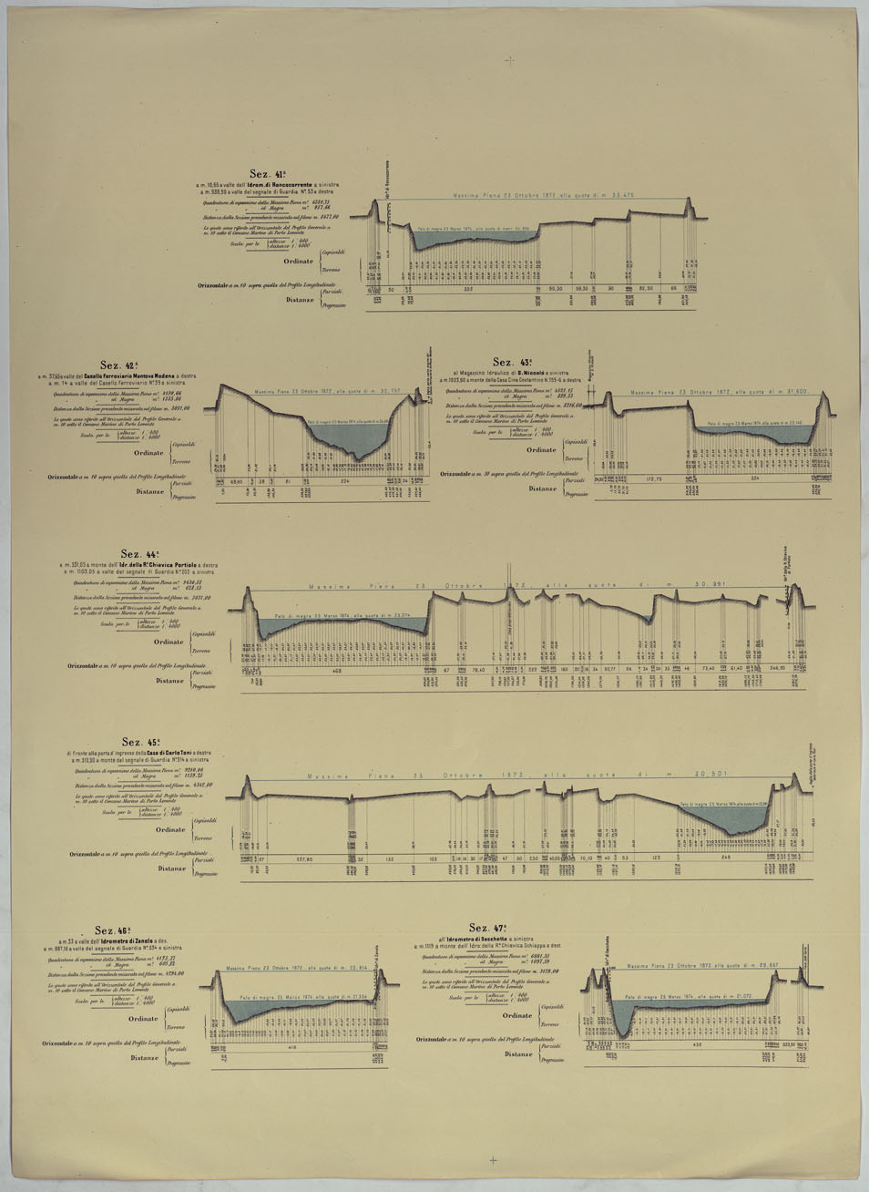 "PROFILO DI LEVELLAZIONE DEL FIUME PO DA MONCALIERI AL MARE ADRIATICO PER LA FOCE DELLE TOLLE. - Livellazione del fiume Po da Moncalieri al mare eseguita negli anni 1874-1875 dagli uffici del Genio Civile di Torino, Pavia, Milano, Piacenza, Mantova, Parma, Reggio Emilia, Rovigo e Ferrara per deliberazione della Commissione Tecnico-Scentifico istituita con R° Decreto 16 Febbraio 1873 sotta la direzione dell'Ispettore del Genio Civile Comm.e P. Barillari e pubblicata per cura della Direzione Generale delle Opere Idrauliche."