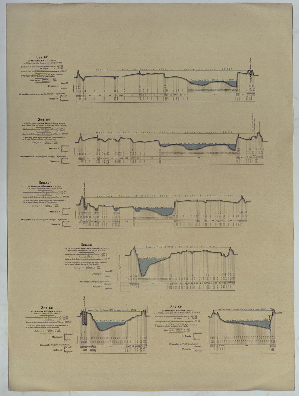 "PROFILO DI LEVELLAZIONE DEL FIUME PO DA MONCALIERI AL MARE ADRIATICO PER LA FOCE DELLE TOLLE. - Livellazione del fiume Po da Moncalieri al mare eseguita negli anni 1874-1875 dagli uffici del Genio Civile di Torino, Pavia, Milano, Piacenza, Mantova, Parma, Reggio Emilia, Rovigo e Ferrara per deliberazione della Commissione Tecnico-Scentifico istituita con R° Decreto 16 Febbraio 1873 sotta la direzione dell'Ispettore del Genio Civile Comm.e P. Barillari e pubblicata per cura della Direzione Generale delle Opere Idrauliche."