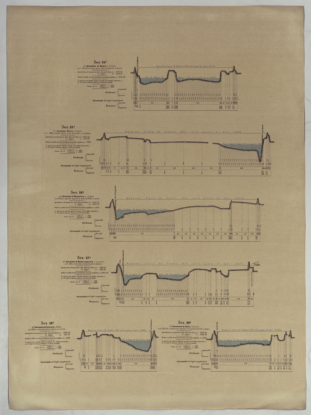 "PROFILO DI LEVELLAZIONE DEL FIUME PO DA MONCALIERI AL MARE ADRIATICO PER LA FOCE DELLE TOLLE. - Livellazione del fiume Po da Moncalieri al mare eseguita negli anni 1874-1875 dagli uffici del Genio Civile di Torino, Pavia, Milano, Piacenza, Mantova, Parma, Reggio Emilia, Rovigo e Ferrara per deliberazione della Commissione Tecnico-Scentifico istituita con R° Decreto 16 Febbraio 1873 sotta la direzione dell'Ispettore del Genio Civile Comm.e P. Barillari e pubblicata per cura della Direzione Generale delle Opere Idrauliche."