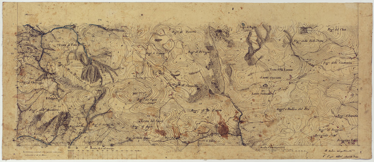"Rilievo regolare in 99 tavolette (minute di campagna) del territorio della Contea di Nizza. Il rilievo è dimostrato a curve orizzontali, tracciate all'equidistanza di 10 metri. Gli operatori furono ufficiali di armi diverse, probabilmente allievi della Scuola di S. M. : Avet, Albert, Borson, Basso, Bergalli, Costanze, Cordon, Ceva, Colli, Carderina, Cordero, Coda, Di Pralormo, Dal Pozzo, De Fornari, De Candia, D'Angennes, Escoffier, Federici, Falicon, Govone, La Grange, La Fleche, Muletti, Marazzano, Mazè, Morozzo, Mariani, Pictet, Ponzani, Piola Caselle, Righini, Rinaudo, Ricci, S. Andrea, Somis, Villamarina. "