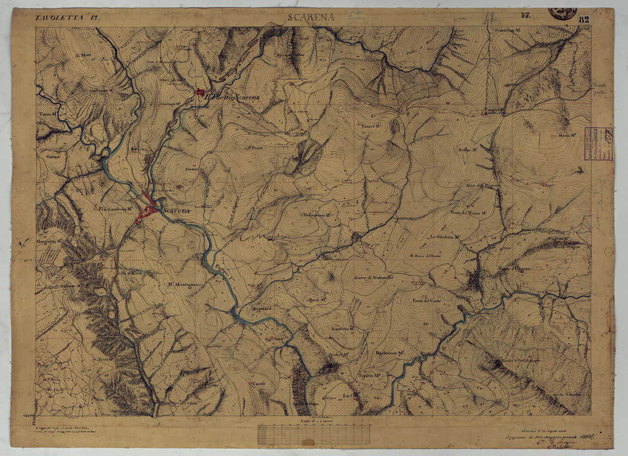 "Rilievo regolare in 99 tavolette (minute di campagna) del territorio della Contea di Nizza. Il rilievo è dimostrato a curve orizzontali, tracciate all'equidistanza di 10 metri. Gli operatori furono ufficiali di armi diverse, probabilmente allievi della Scuola di S. M. : Avet, Albert, Borson, Basso, Bergalli, Costanze, Cordon, Ceva, Colli, Carderina, Cordero, Coda, Di Pralormo, Dal Pozzo, De Fornari, De Candia, D'Angennes, Escoffier, Federici, Falicon, Govone, La Grange, La Fleche, Muletti, Marazzano, Mazè, Morozzo, Mariani, Pictet, Ponzani, Piola Caselle, Righini, Rinaudo, Ricci, S. Andrea, Somis, Villamarina. "