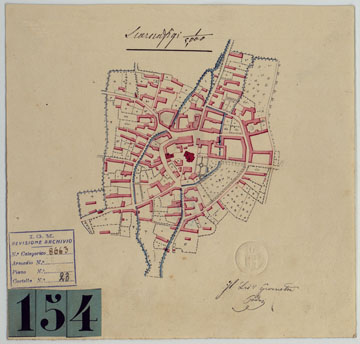 "Gruppo di 12 piante, disegnate ad acquerello, probabilmente di origine catastale, riconosciute da ufficiali dello Stato Maggiore e da Topografi (Cap. Basso, Cap. Lafleche, Geometra Coda) per servire alla carta generale degli Stati Sardi al 50.000."