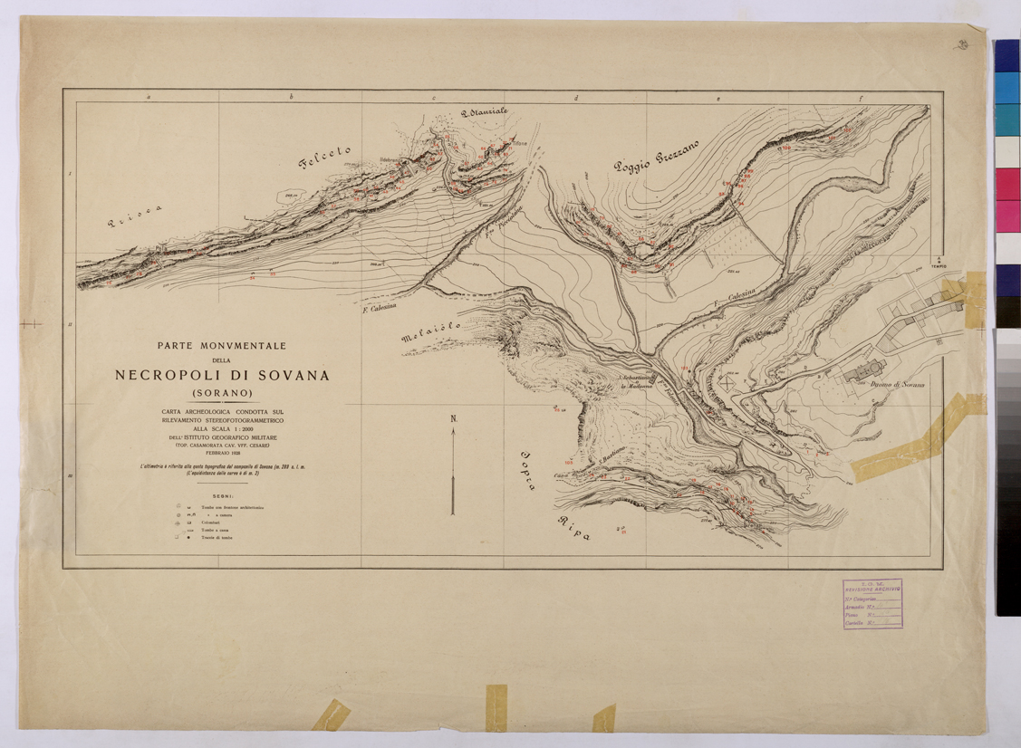 PARTE MONUMENTALE DELLA NECROPOLI DI SOVANA SORANO CARTA ARCHEOLOGICA CONDATTA SUL RILEVAMENTO STEREOFOTOGRAMMETRICO ALLA SCALA DI 1:2.000 DELL'ISTITUTO GEOGRAFICO MILITARE TOP CASAMORATA CAV.UFF. CESARE.