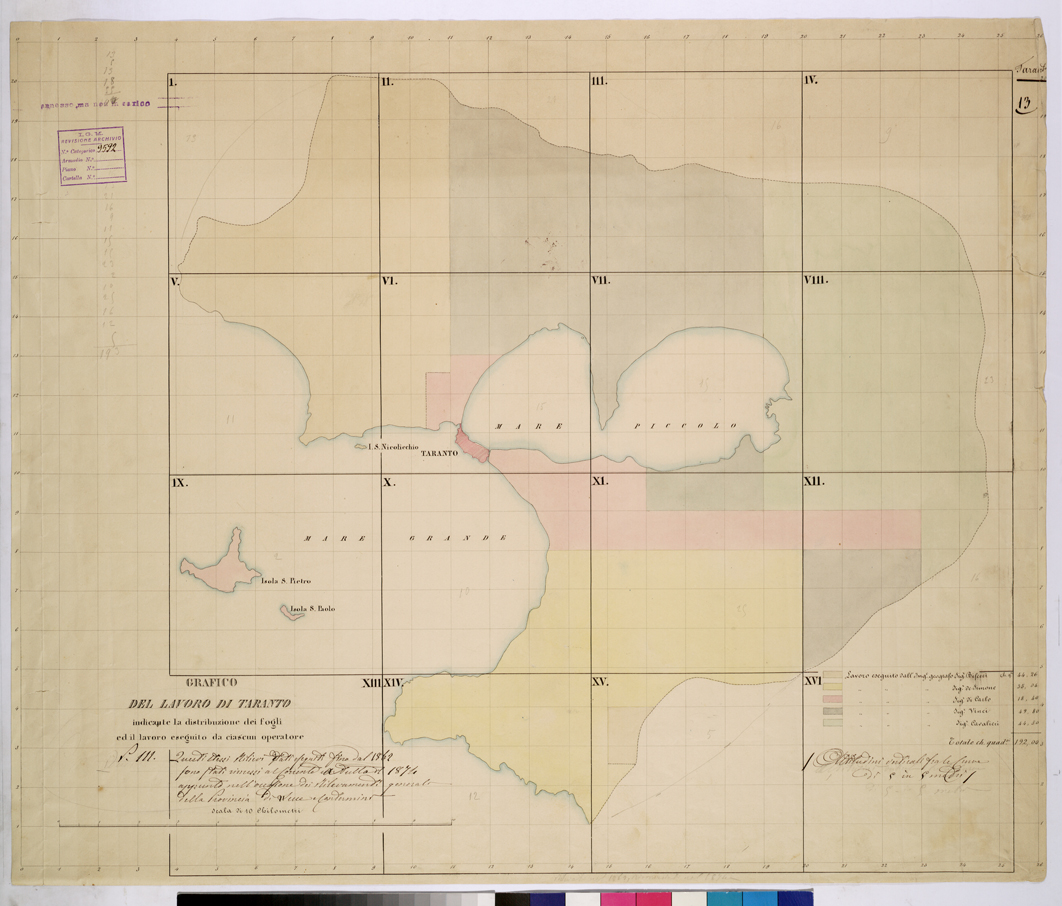 PIANTA TOPOGRAFICA DI TARANTO E DINTORNI LEVATA 1 10.000 NELL'ANNO 1862 - QUADRO D'UNIONE A COLORI.