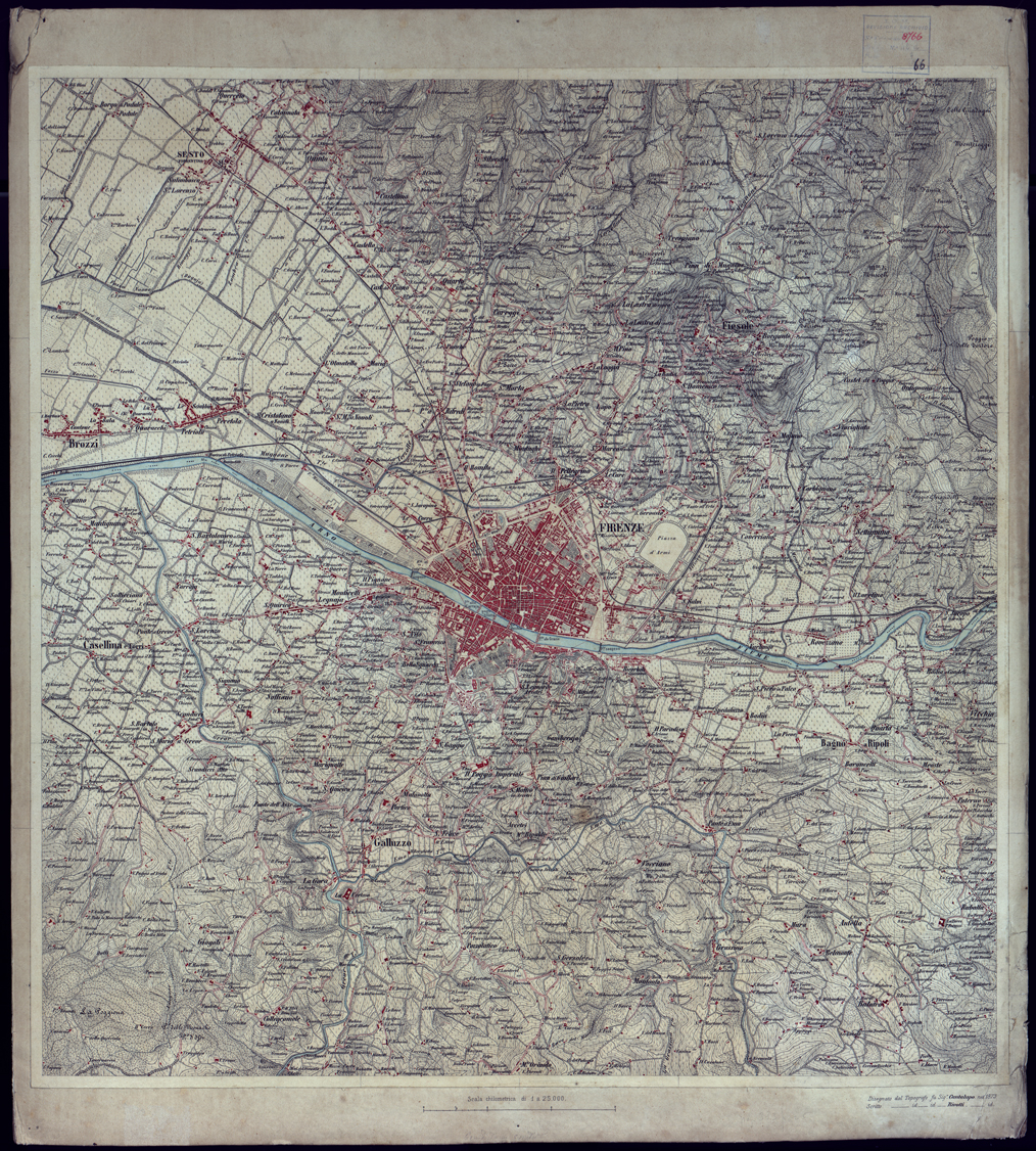 "Il titolo non è presente sulla carta. Foglio modello di Firenze e dintorni che servì per la riproduzione della prima carta che l'I.G.M. fece nel 1873 di Firenze e dintorni. Un foglio montato su cartone firmato Cantalupo e Rivotti. Rappresenta l'orografia a curve di livello, abitati e strade principali in rosso, acque in azzurro. (Cfr. anche Dintorni di Firenze - Doc. N° 8765 Cart. d' Arch. N° 67 Carta dei dintorni di Firenze - Docum. 8768 Cart. d' Arch. N° 67 Carta di Firenze e dintorni alla scala di 1:7.500, Inv. n. 4770)."
