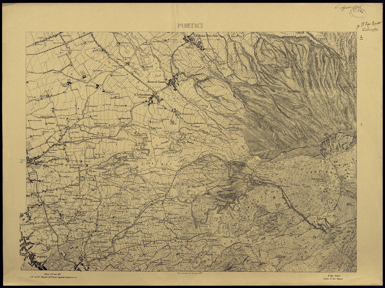 CARTA TOPOGRAFICA DEL MONTE VESUVIO RILEVATA E DISEGNATA DAGLI ALLIEVI DELL'IST. TOPOGRAFICO MILITARE NEGLI ANNI 1875-76 ALLA SCALA DI 1:10.000. LA DATA RIPORTATA E' 1905 - PORTICI.