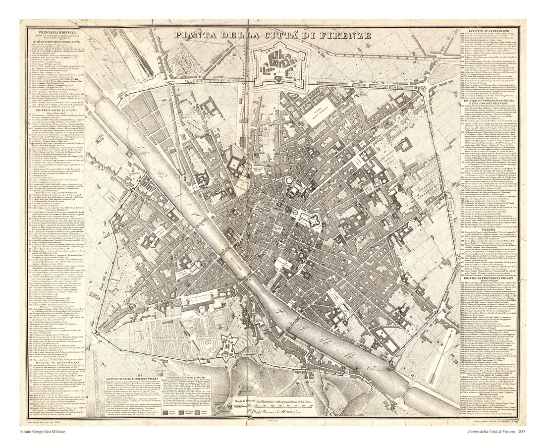 "CARTE E STAMPE ANTICHE, COPIA IN PRONTA CONSEGNA DI ELEMENTO DI CARTOGRAFIA STORICA INSERITO NEL CATALOGO DEI PRODOTTI IN VENDITA A18 REALIZZATO DALL'ORIGINALE CONSERVATO PRESSO L'ISTITUTO GEOGRAFICO MILITARE. Rappresentazione orografica a tratteggio. Intorno alla carta l'elenco de "Principali Edifizii, artisti che ne diedero il disegno ed epoca della loro costruzione". Gius. Pozzi dis. e inc., A. Paris imp. Firenze presso l'incisore. FILE:B0007087"