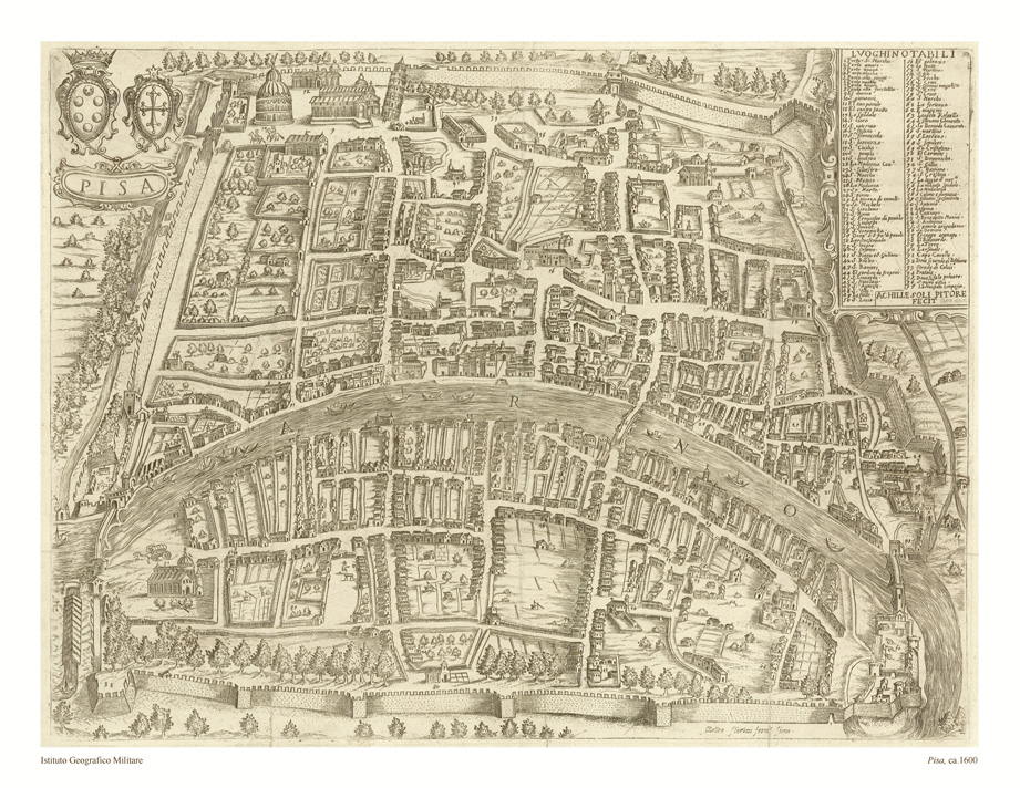 "CARTE E STAMPE ANTICHE, COPIA IN PRONTA CONSEGNA DI ELEMENTO DI CARTOGRAFIA STORICA INSERITO NEL CATALOGO DEI PRODOTTI IN VENDITA A35 REALIZZATO DALL'ORIGINALE CONSERVATO PRESSO L'ISTITUTO GEOGRAFICO MILITARE. Pianta prospettica. A sinistra in alto gli stemmi dei Medici e della città. A destra l' elenco numerico dei " Luoghi notabili ". FILE: B0007169 "