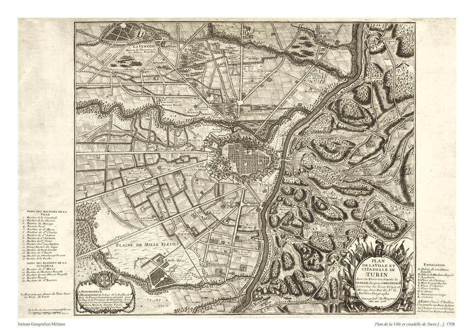 PLAN DE LA VILLE ET CITADELLE DE TURIN AVEC SES ENVIRONS DEPUIS LA VENERIE JUSQUES A MILLEFLEURS LEVEE SUR LES LIEUX DRESSE ET MIS AU JOUR PAR LE S.R.G. BAITTIEN GEOGRAPHE AVEC PIVIL DU ROY POUR DIX ANS 1708.
