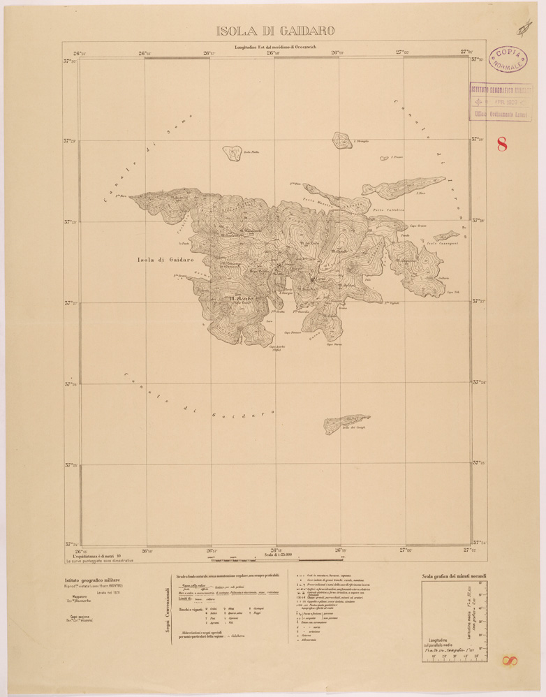 "I rilievi per la realizzazione della carta delle isole Italiane dell' Egeo alla scala di 1:25.000 ( quadro d' unione file SE000124 ) furono eseguiti negli anni dal 1922 al 1934, le isole più piccole ( 21 fogli Categorico 9776 ) non furono regolarmente suddivise per tavolette ma realizzate ad isole intere, un foglio per ognuna mentre le tre più grandi ( Coo Rodi e Scarpanto, categorico 9822 ) furono suddivise in tavolette dello stesso formato della carta d' Italia le prime due e in sei fogli con numerazione propria quest' ultima, per informazioni più dettagliate vedere la rivista L' Universo numero 7 del 1929"