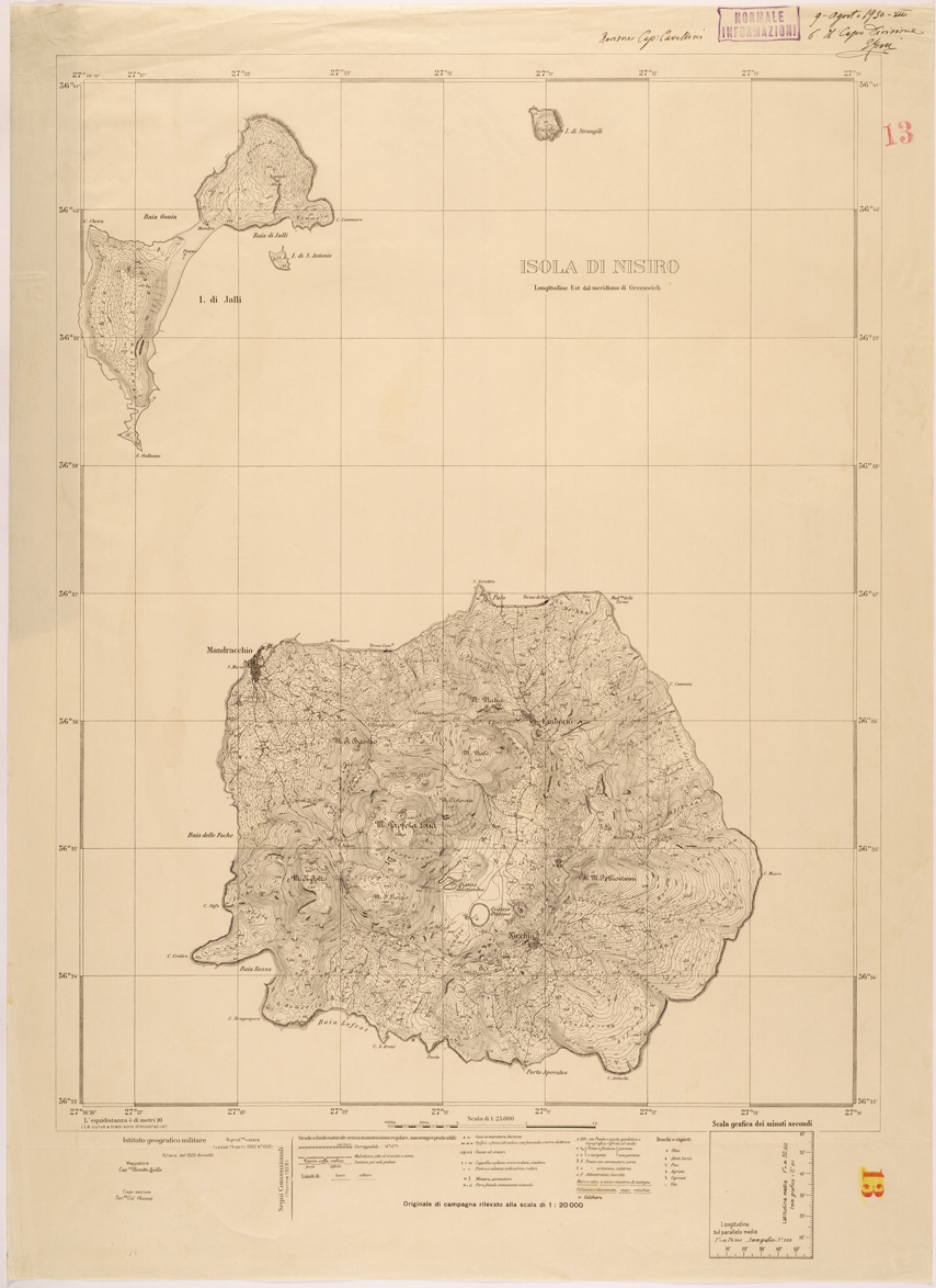 "I rilievi per la realizzazione della carta delle isole Italiane dell' Egeo alla scala di 1:25.000 ( quadro d' unione file SE000124 ) furono eseguiti negli anni dal 1922 al 1934, le isole più piccole ( 21 fogli Categorico 9776 ) non furono regolarmente suddivise per tavolette ma realizzate ad isole intere, un foglio per ognuna mentre le tre più grandi ( Coo Rodi e Scarpanto, categorico 9822 ) furono suddivise in tavolette dello stesso formato della carta d' Italia le prime due e in sei fogli con numerazione propria quest' ultima, per informazioni più dettagliate vedere la rivista L' Universo numero 7 del 1929"
