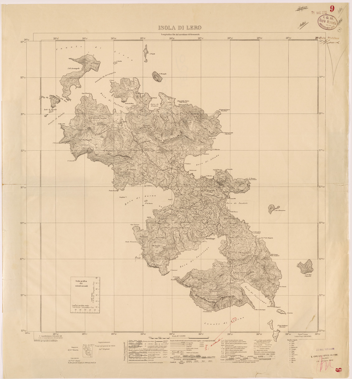 "I rilievi per la realizzazione della carta delle isole Italiane dell' Egeo alla scala di 1:25.000 ( quadro d' unione file SE000124 ) furono eseguiti negli anni dal 1922 al 1934, le isole più piccole ( 21 fogli Categorico 9776 ) non furono regolarmente suddivise per tavolette ma realizzate ad isole intere, un foglio per ognuna mentre le tre più grandi ( Coo Rodi e Scarpanto, categorico 9822 ) furono suddivise in tavolette dello stesso formato della carta d' Italia le prime due e in sei fogli con numerazione propria quest' ultima, per informazioni più dettagliate vedere la rivista L' Universo numero 7 del 1929"