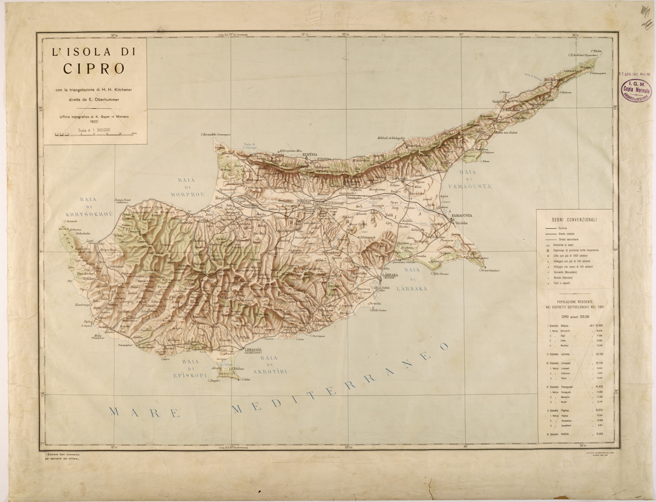 "Carta compilata nel 1941 derivandola mediante ingrandimento dalla carta tedesca di E. Oberhummer alla scala di 1:500.000 la toponomastica fù in parte aggiornata con una carta alla scala di 1:750.000 più recente ugualmente edita in Germania dall' Istituto Geografico Wagner di Lipsia, da questa stessa carta furono ricavati la rete ferroviaria, quella stradale e l' idrografia mentre i limiti di bosco da una carta Inglese alla scala di 1:348.480 contemporaneamente, con gli stessi criteri e documenti fù compilata anche la Carta dell' Isola di Cipro alla scala di 1:200.000 ( File SE000185 categorico 9954 )"