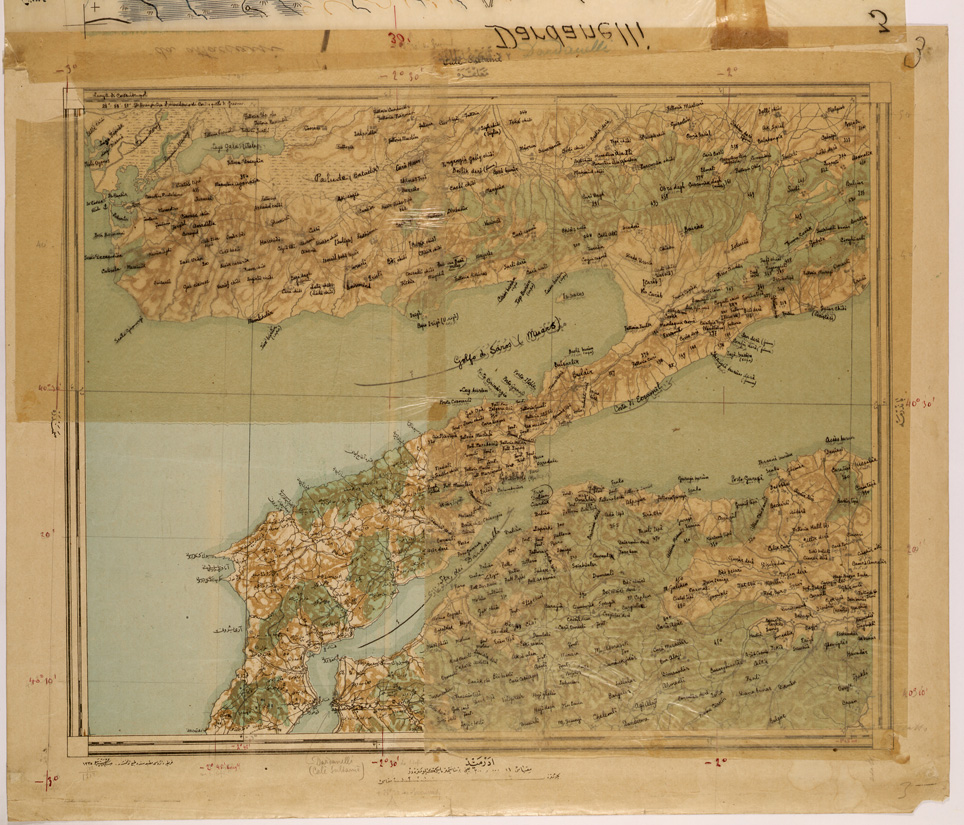 "Carta Turca compilata negli anni dal 1909 al 1916 e stampata nella tipografia della sezione cartografica nel 1917 su alcuni fogli è sovrapposto un lucido con la traduzione Italiana della toponomastica."