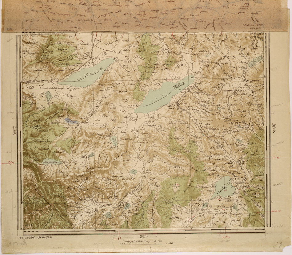 "Carta Turca compilata negli anni dal 1909 al 1916 e stampata nella tipografia della sezione cartografica nel 1917 su alcuni fogli è sovrapposto un lucido con la traduzione Italiana della toponomastica."