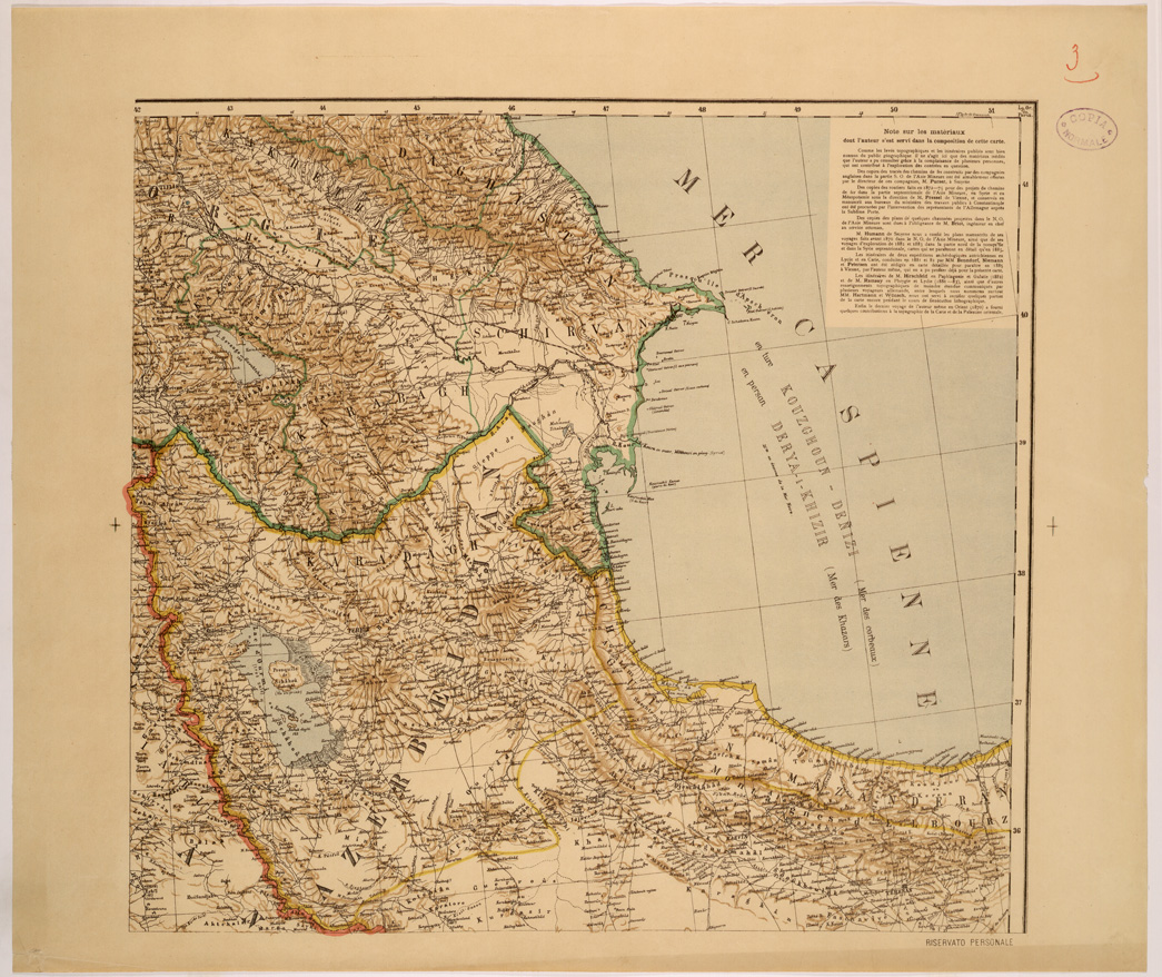 "Carta compilata nel 1883 da Henri Kiepert e aggiornata parzialmente per le ferrovie nel 1891 la carta riporta, stampate in Francese, le fonti di compilazione, note sulle divisioni amministrative e la trascrizione dei nomi moderni in lingue orientali."