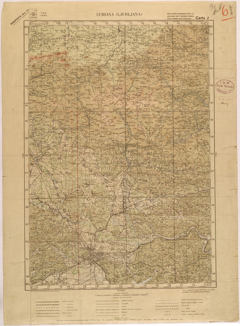 "Carta compilata dalla divisione cartografica dell' IGM dal Settembre 1939 ad Aprile 1940 con aggiornamenti del 1941 per viabilità e toponomastica, gli originali furono ricavati dal ridisegno della carta Jugoslava alla stessa scala traducendo i toponimi originali, in parte Latini in parte Cirillici. Lavoro ordinato dal Comando di Stato Maggiore per le Forze Armate operanti nella zona."