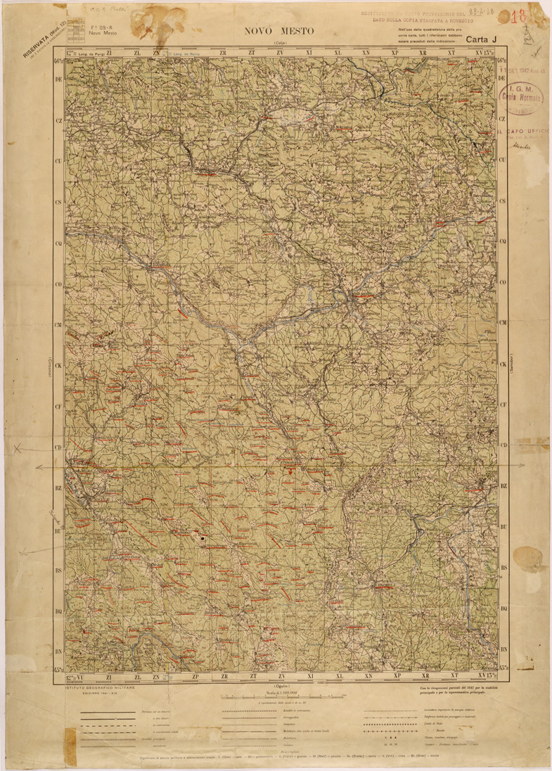 "Carta compilata dalla divisione cartografica dell' IGM dal Settembre 1939 ad Aprile 1940 con aggiornamenti del 1941 per viabilità e toponomastica, gli originali furono ricavati dal ridisegno della carta Jugoslava alla stessa scala traducendo i toponimi originali, in parte Latini in parte Cirillici. Lavoro ordinato dal Comando di Stato Maggiore per le Forze Armate operanti nella zona."