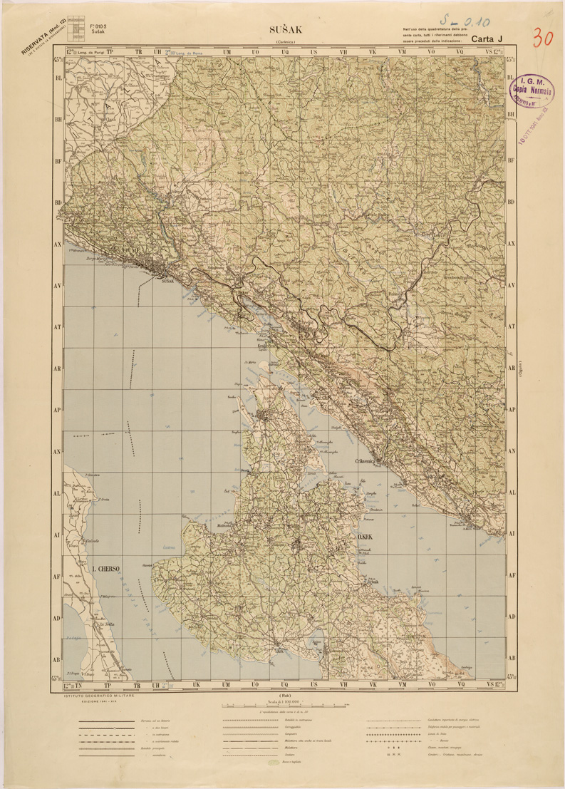"Carta compilata dalla divisione cartografica dell' IGM dal Settembre 1939 ad Aprile 1940 con aggiornamenti del 1941 per viabilità e toponomastica, gli originali furono ricavati dal ridisegno della carta Jugoslava alla stessa scala traducendo i toponimi originali, in parte Latini in parte Cirillici. Lavoro ordinato dal Comando di Stato Maggiore per le Forze Armate operanti nella zona."
