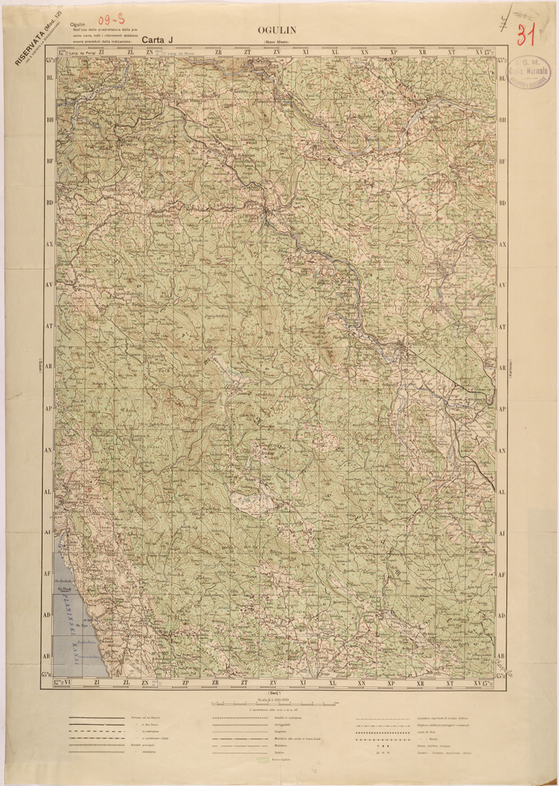 "Carta compilata dalla divisione cartografica dell' IGM dal Settembre 1939 ad Aprile 1940 con aggiornamenti del 1941 per viabilità e toponomastica, gli originali furono ricavati dal ridisegno della carta Jugoslava alla stessa scala traducendo i toponimi originali, in parte Latini in parte Cirillici. Lavoro ordinato dal Comando di Stato Maggiore per le Forze Armate operanti nella zona."