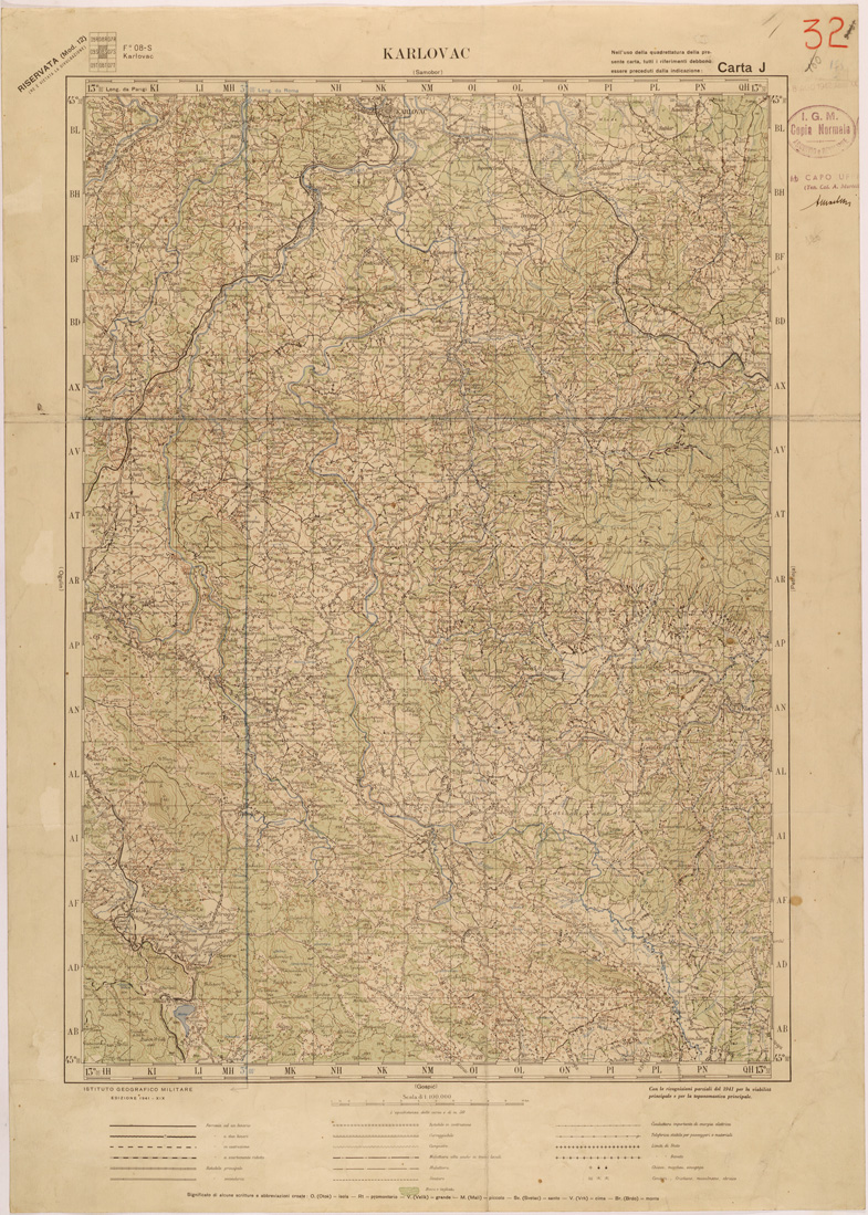 "Carta compilata dalla divisione cartografica dell' IGM dal Settembre 1939 ad Aprile 1940 con aggiornamenti del 1941 per viabilità e toponomastica, gli originali furono ricavati dal ridisegno della carta Jugoslava alla stessa scala traducendo i toponimi originali, in parte Latini in parte Cirillici. Lavoro ordinato dal Comando di Stato Maggiore per le Forze Armate operanti nella zona."