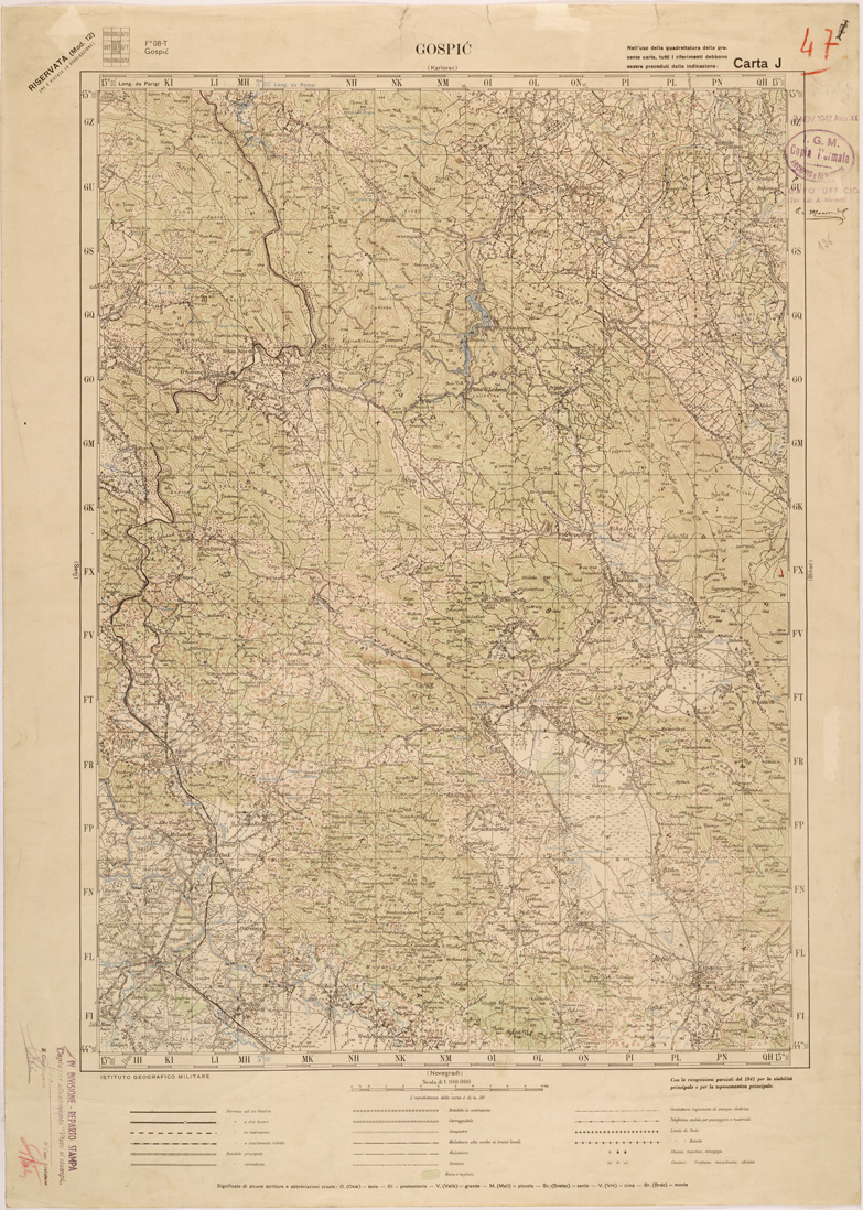 "Carta compilata dalla divisione cartografica dell' IGM dal Settembre 1939 ad Aprile 1940 con aggiornamenti del 1941 per viabilità e toponomastica, gli originali furono ricavati dal ridisegno della carta Jugoslava alla stessa scala traducendo i toponimi originali, in parte Latini in parte Cirillici. Lavoro ordinato dal Comando di Stato Maggiore per le Forze Armate operanti nella zona."