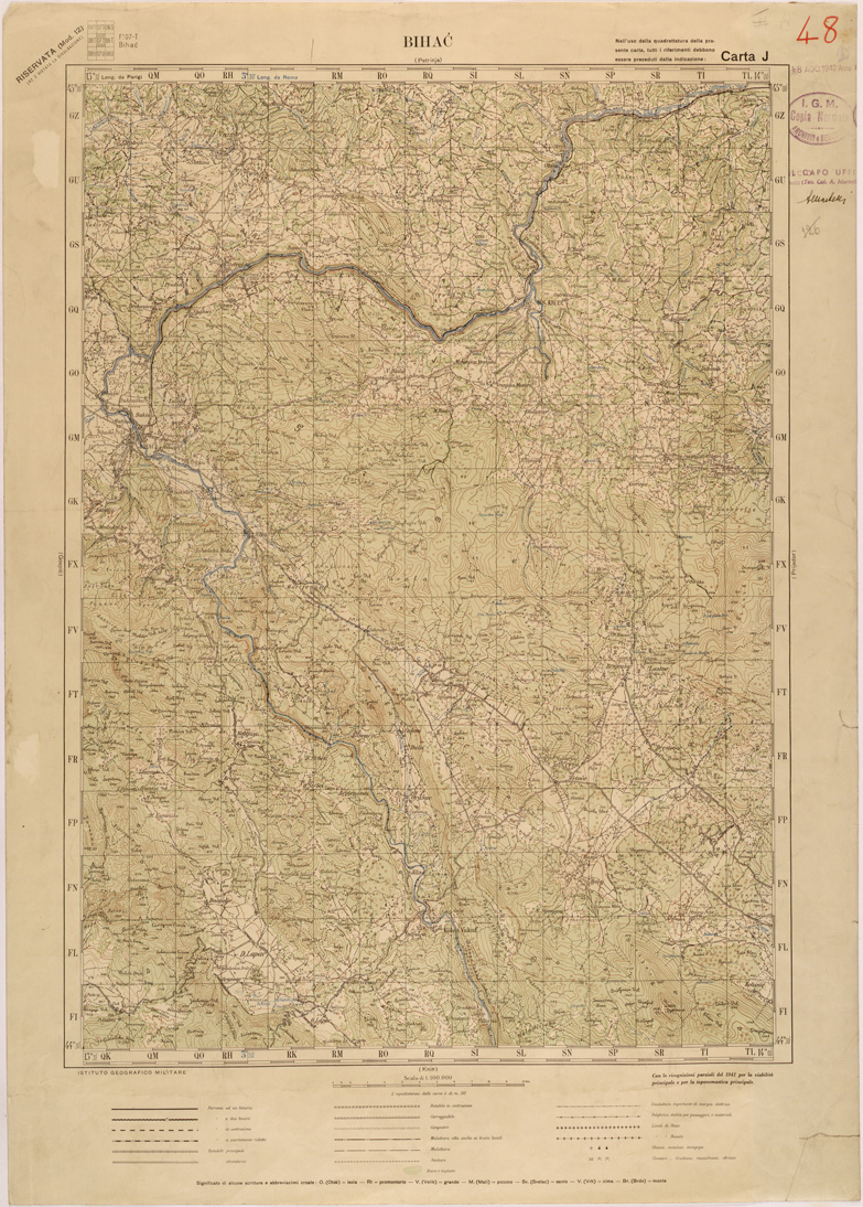 "Carta compilata dalla divisione cartografica dell' IGM dal Settembre 1939 ad Aprile 1940 con aggiornamenti del 1941 per viabilità e toponomastica, gli originali furono ricavati dal ridisegno della carta Jugoslava alla stessa scala traducendo i toponimi originali, in parte Latini in parte Cirillici. Lavoro ordinato dal Comando di Stato Maggiore per le Forze Armate operanti nella zona."