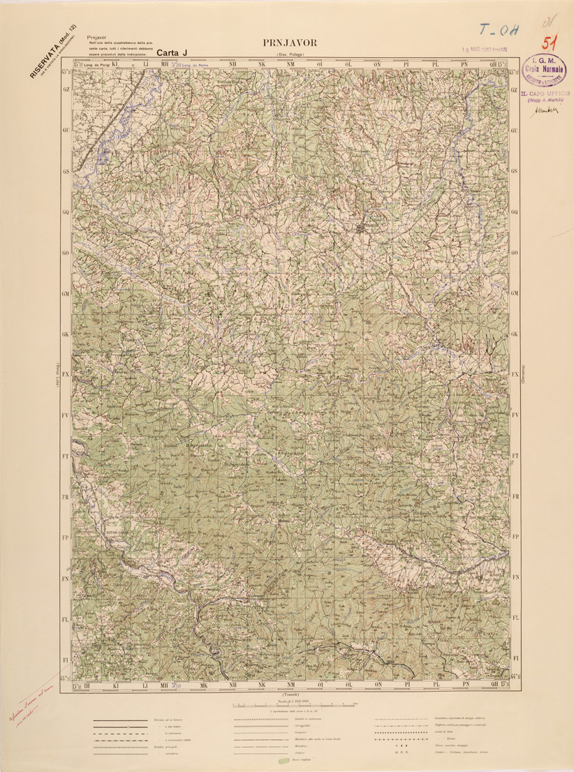 "Carta compilata dalla divisione cartografica dell' IGM dal Settembre 1939 ad Aprile 1940 con aggiornamenti del 1941 per viabilità e toponomastica, gli originali furono ricavati dal ridisegno della carta Jugoslava alla stessa scala traducendo i toponimi originali, in parte Latini in parte Cirillici. Lavoro ordinato dal Comando di Stato Maggiore per le Forze Armate operanti nella zona."