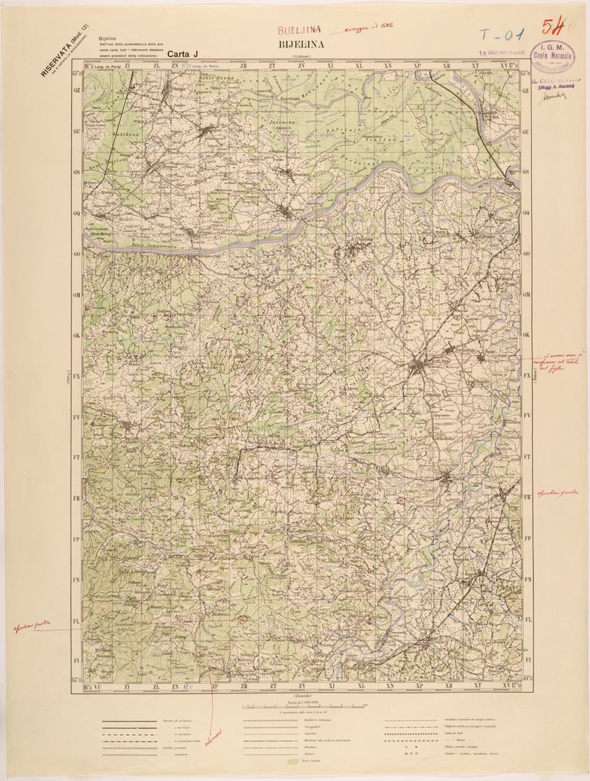 "Carta compilata dalla divisione cartografica dell' IGM dal Settembre 1939 ad Aprile 1940 con aggiornamenti del 1941 per viabilità e toponomastica, gli originali furono ricavati dal ridisegno della carta Jugoslava alla stessa scala traducendo i toponimi originali, in parte Latini in parte Cirillici. Lavoro ordinato dal Comando di Stato Maggiore per le Forze Armate operanti nella zona."