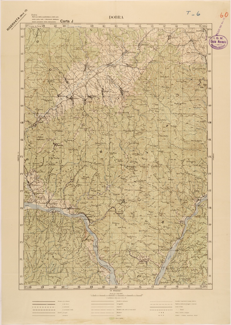 "Carta compilata dalla divisione cartografica dell' IGM dal Settembre 1939 ad Aprile 1940 con aggiornamenti del 1941 per viabilità e toponomastica, gli originali furono ricavati dal ridisegno della carta Jugoslava alla stessa scala traducendo i toponimi originali, in parte Latini in parte Cirillici. Lavoro ordinato dal Comando di Stato Maggiore per le Forze Armate operanti nella zona."