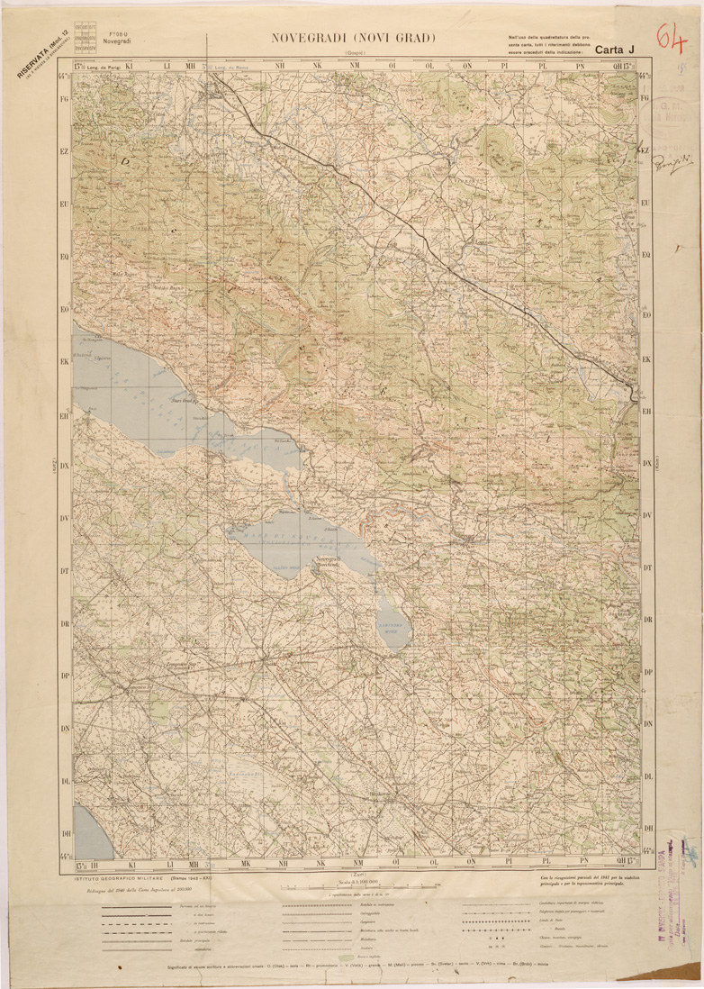 "Carta compilata dalla divisione cartografica dell' IGM dal Settembre 1939 ad Aprile 1940 con aggiornamenti del 1941 per viabilità e toponomastica, gli originali furono ricavati dal ridisegno della carta Jugoslava alla stessa scala traducendo i toponimi originali, in parte Latini in parte Cirillici. Lavoro ordinato dal Comando di Stato Maggiore per le Forze Armate operanti nella zona."