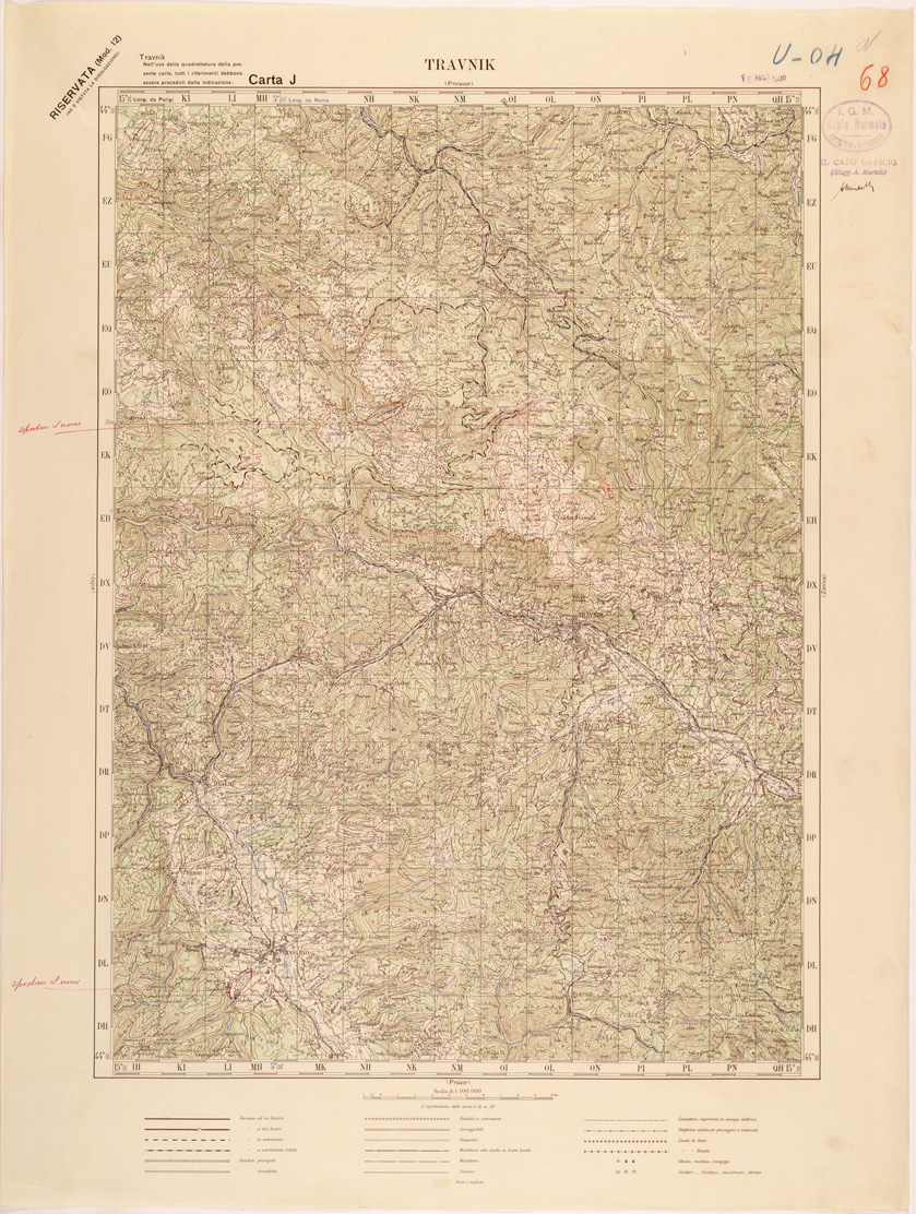 "Carta compilata dalla divisione cartografica dell' IGM dal Settembre 1939 ad Aprile 1940 con aggiornamenti del 1941 per viabilità e toponomastica, gli originali furono ricavati dal ridisegno della carta Jugoslava alla stessa scala traducendo i toponimi originali, in parte Latini in parte Cirillici. Lavoro ordinato dal Comando di Stato Maggiore per le Forze Armate operanti nella zona."