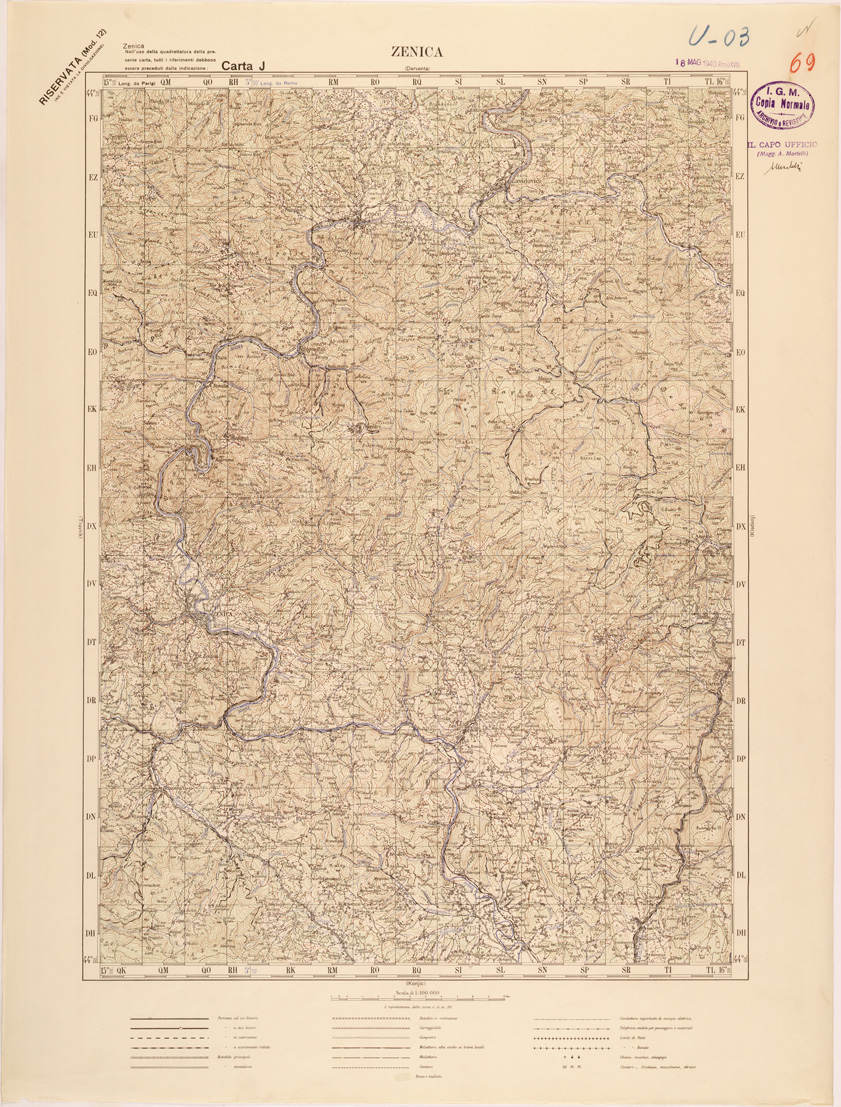 "Carta compilata dalla divisione cartografica dell' IGM dal Settembre 1939 ad Aprile 1940 con aggiornamenti del 1941 per viabilità e toponomastica, gli originali furono ricavati dal ridisegno della carta Jugoslava alla stessa scala traducendo i toponimi originali, in parte Latini in parte Cirillici. Lavoro ordinato dal Comando di Stato Maggiore per le Forze Armate operanti nella zona."