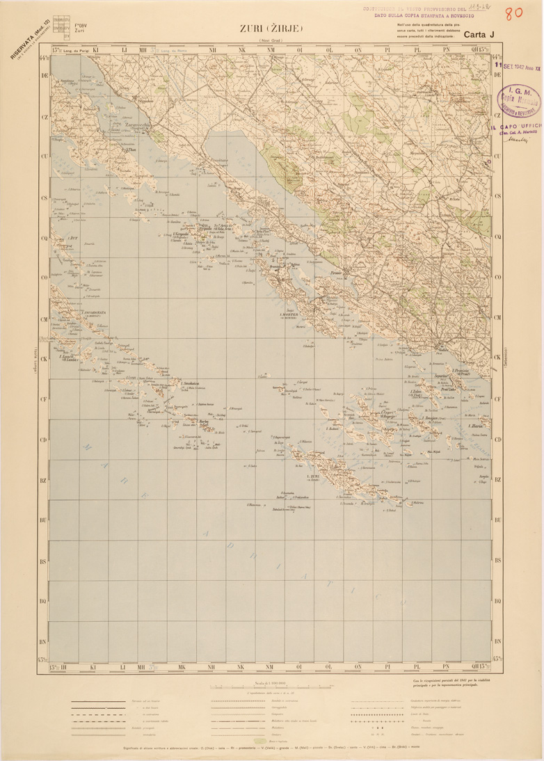 "Carta compilata dalla divisione cartografica dell' IGM dal Settembre 1939 ad Aprile 1940 con aggiornamenti del 1941 per viabilità e toponomastica, gli originali furono ricavati dal ridisegno della carta Jugoslava alla stessa scala traducendo i toponimi originali, in parte Latini in parte Cirillici. Lavoro ordinato dal Comando di Stato Maggiore per le Forze Armate operanti nella zona."