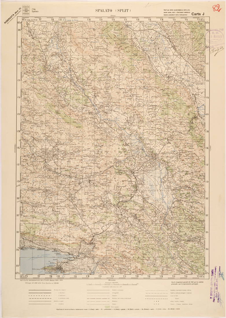 "Carta compilata dalla divisione cartografica dell' IGM dal Settembre 1939 ad Aprile 1940 con aggiornamenti del 1941 per viabilità e toponomastica, gli originali furono ricavati dal ridisegno della carta Jugoslava alla stessa scala traducendo i toponimi originali, in parte Latini in parte Cirillici. Lavoro ordinato dal Comando di Stato Maggiore per le Forze Armate operanti nella zona."
