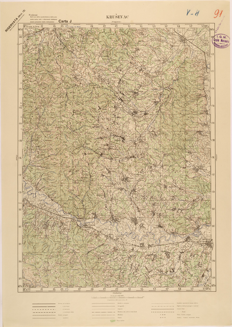 "Carta compilata dalla divisione cartografica dell' IGM dal Settembre 1939 ad Aprile 1940 con aggiornamenti del 1941 per viabilità e toponomastica, gli originali furono ricavati dal ridisegno della carta Jugoslava alla stessa scala traducendo i toponimi originali, in parte Latini in parte Cirillici. Lavoro ordinato dal Comando di Stato Maggiore per le Forze Armate operanti nella zona."