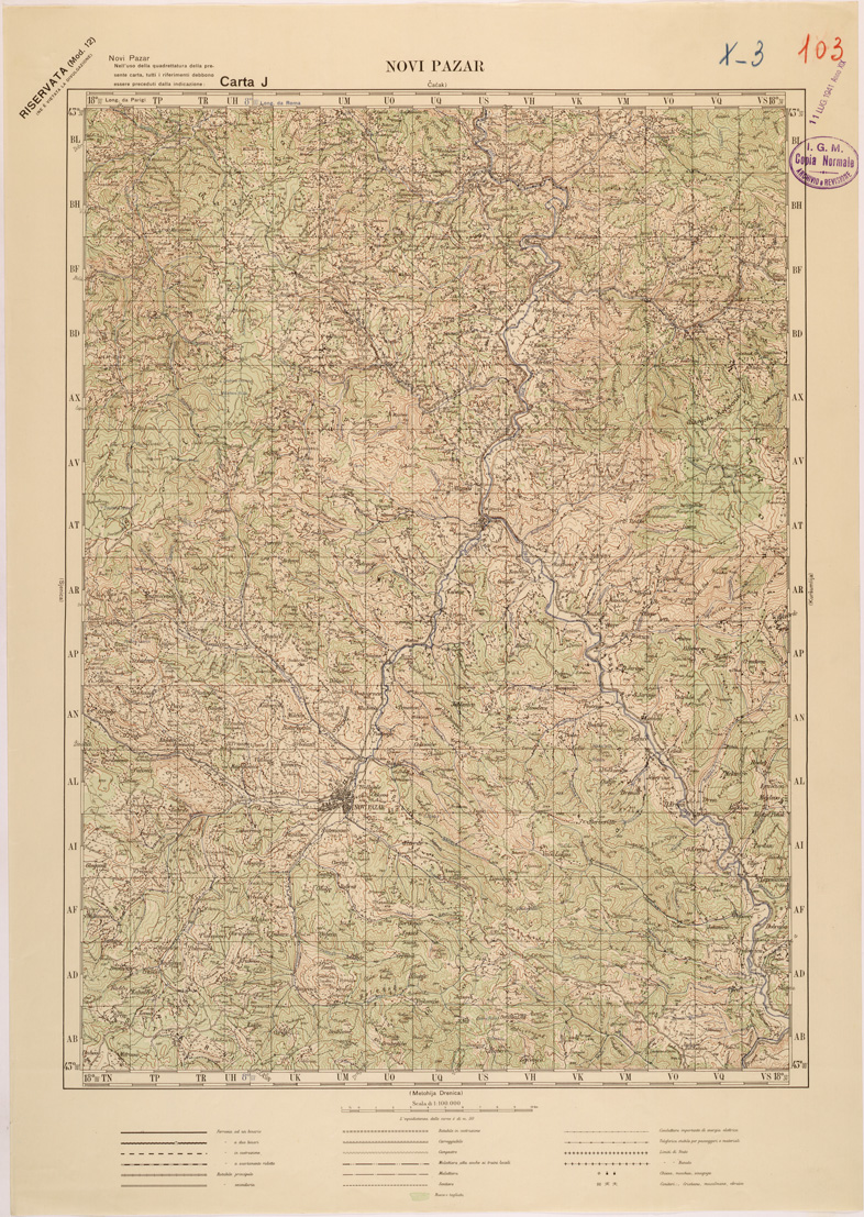 "Carta compilata dalla divisione cartografica dell' IGM dal Settembre 1939 ad Aprile 1940 con aggiornamenti del 1941 per viabilità e toponomastica, gli originali furono ricavati dal ridisegno della carta Jugoslava alla stessa scala traducendo i toponimi originali, in parte Latini in parte Cirillici. Lavoro ordinato dal Comando di Stato Maggiore per le Forze Armate operanti nella zona."