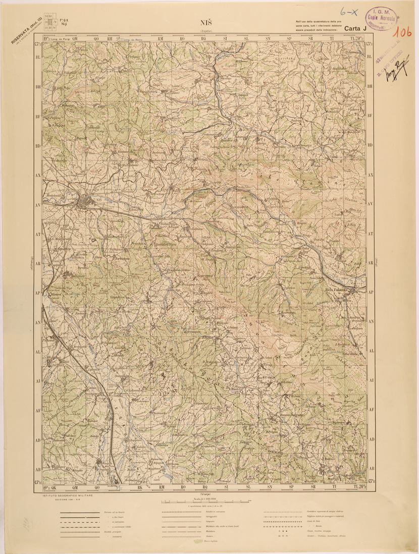 "Carta compilata dalla divisione cartografica dell' IGM dal Settembre 1939 ad Aprile 1940 con aggiornamenti del 1941 per viabilità e toponomastica, gli originali furono ricavati dal ridisegno della carta Jugoslava alla stessa scala traducendo i toponimi originali, in parte Latini in parte Cirillici. Lavoro ordinato dal Comando di Stato Maggiore per le Forze Armate operanti nella zona."